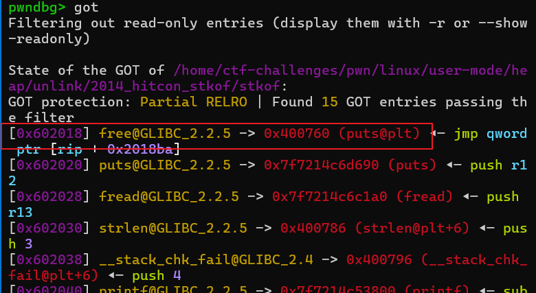 此时我们回收note2,就可以触发unlink,使得ptr[1] = &ptr[1] - 0x18,具体unlink的分析过程可以看第一个例题,其实都差不多,这里就不赘述了。