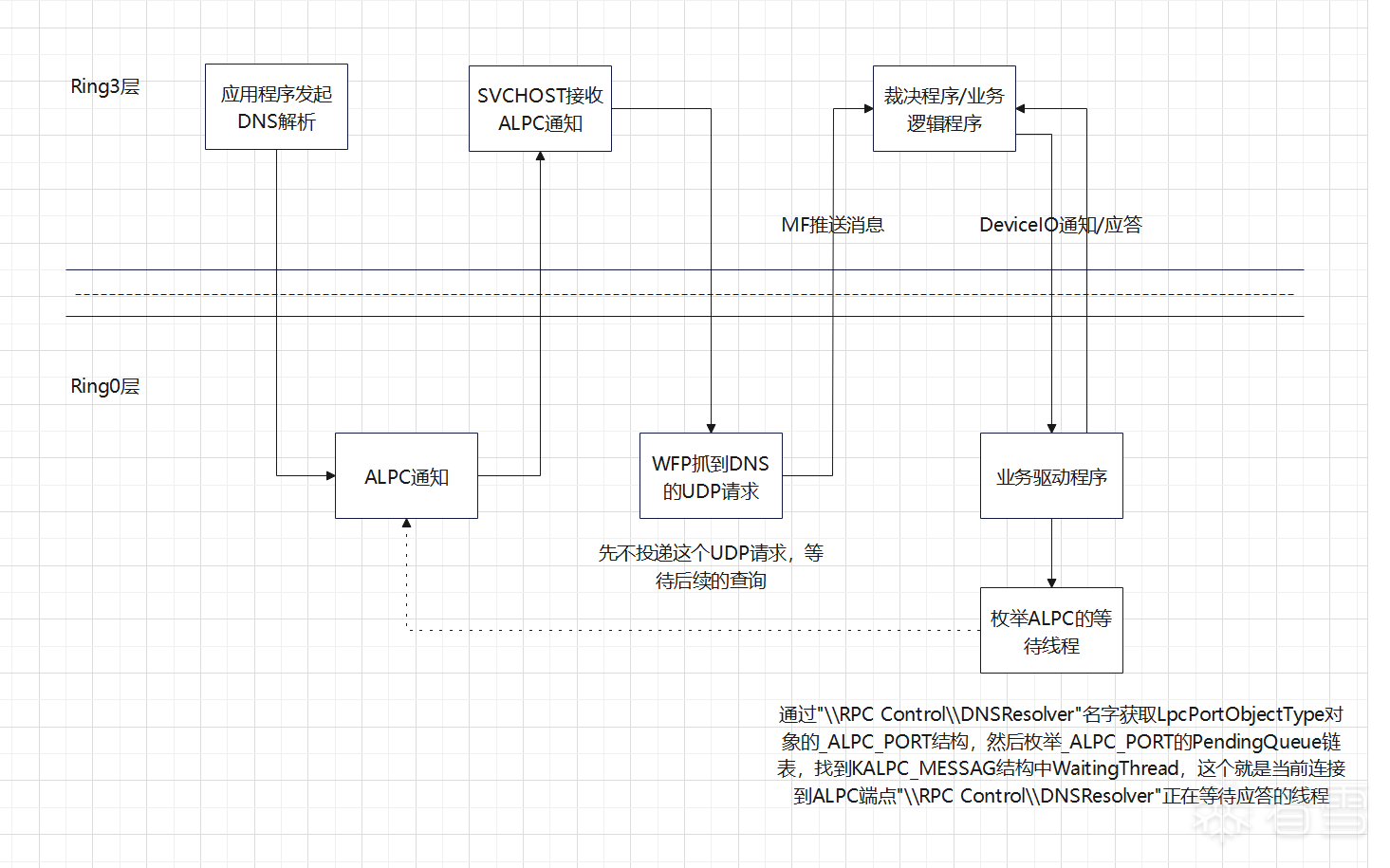 论坛里好多朋友一直在询问如何在内核中比较准确的获取DNS实际发起方的进程,这里给大家抛砖引玉介绍一下我自己的方案,这个方案也有失败几率但是与成功率相比那就忽略了。整个方案的核心思路是在WFP层获取发送的DNS包(目标端口是53,且是UDP协议,基本认为是DNS请求包,然后在做自己的包解析确认是不是),明确了是发送的DNS包之后,接下来就是重点了:借助ALPC线程枚举,找到在等待ALPC应答的线程,通过线程反推PID,获取目标进程。在这个WFP层获取的发包PID不是我们想要的进程pid,这个PID一般都是svchost的进程,就是下面这个:
