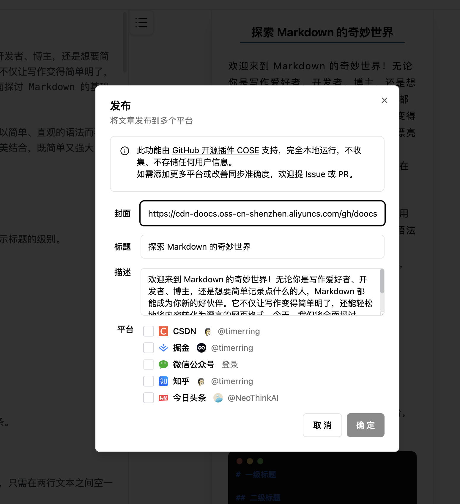 COSE(Create Once Sync Everywhere)是一个开源的浏览器扩展工具,专为内容创作者打造。它与 doocs/md Markdown 编辑器配合,主要解决创作者需要在多个平台重复发布内容的痛点。只需编辑一次,即可一键同步到各大内容平台。