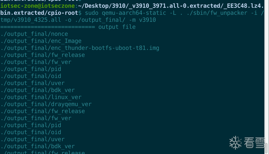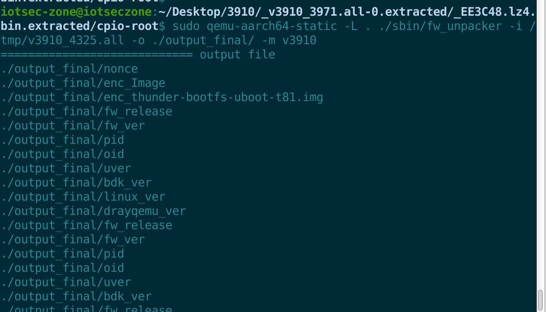 sudo qemu-aarch64-static . ./sbin/fw_unpacker -i /tmp/v3910_4325.all -o ./output_final/ -m v3910