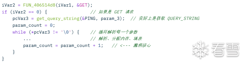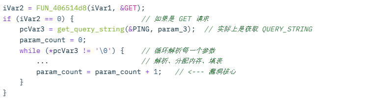 }每次循环找下一个&,在栈上malloc并复制key/value字符串,把堆指针(或指针+1)写道栈上的参数表里面(param_2+offset),param_count++准备下一个槽位。