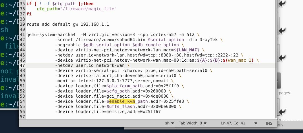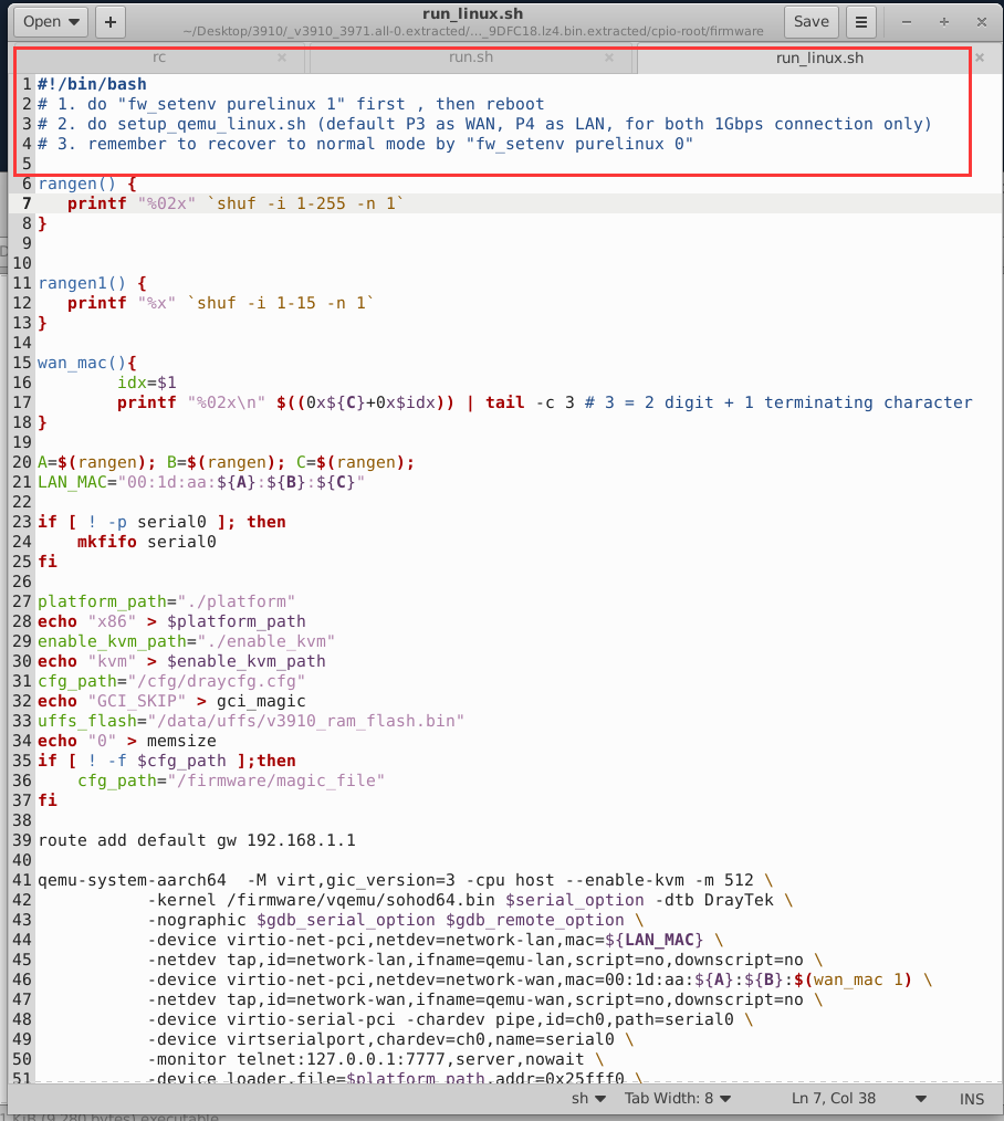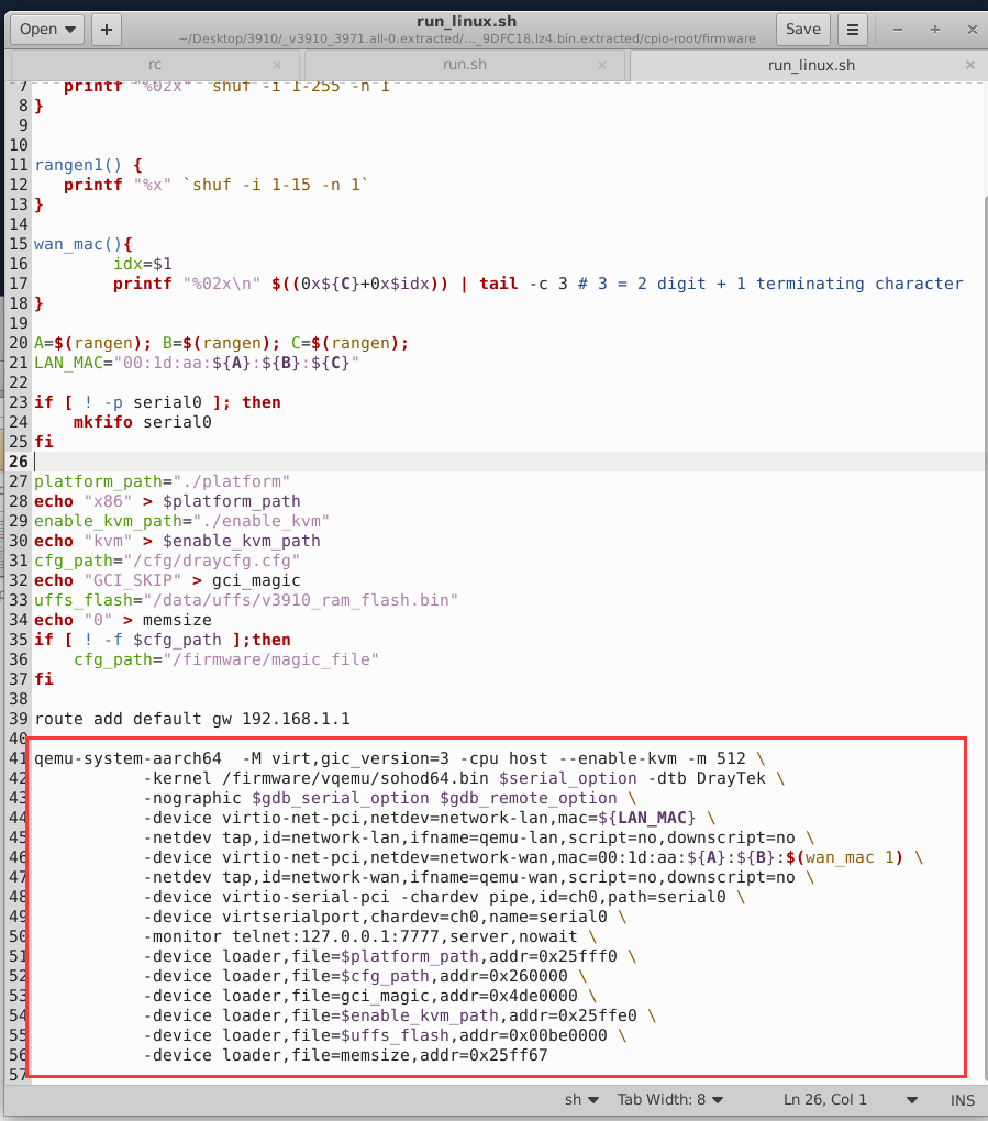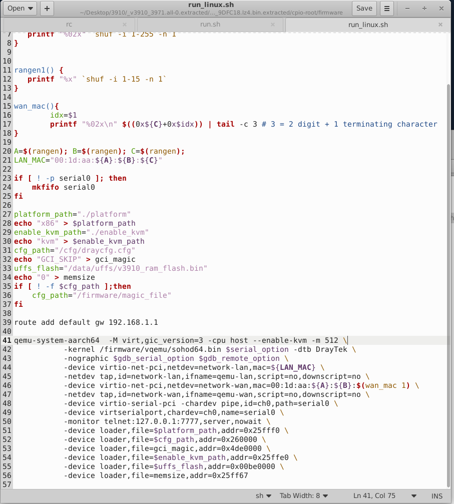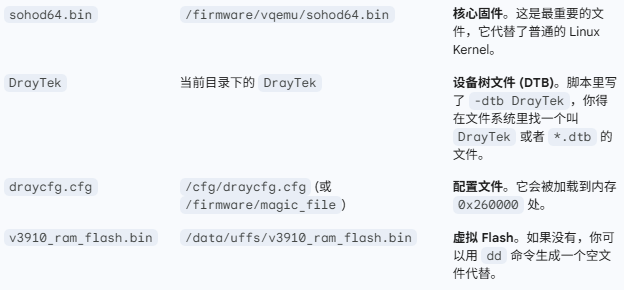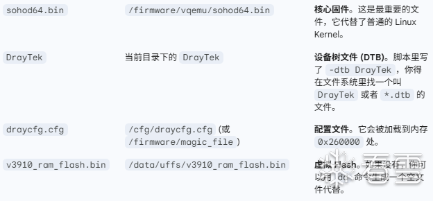 这个脚本是官方开发人员用来启动QEMU模拟环境的原始脚本,sohod64.bin就是核心固件,充当Kernel,其次DrayTek设备树文件(DTB),