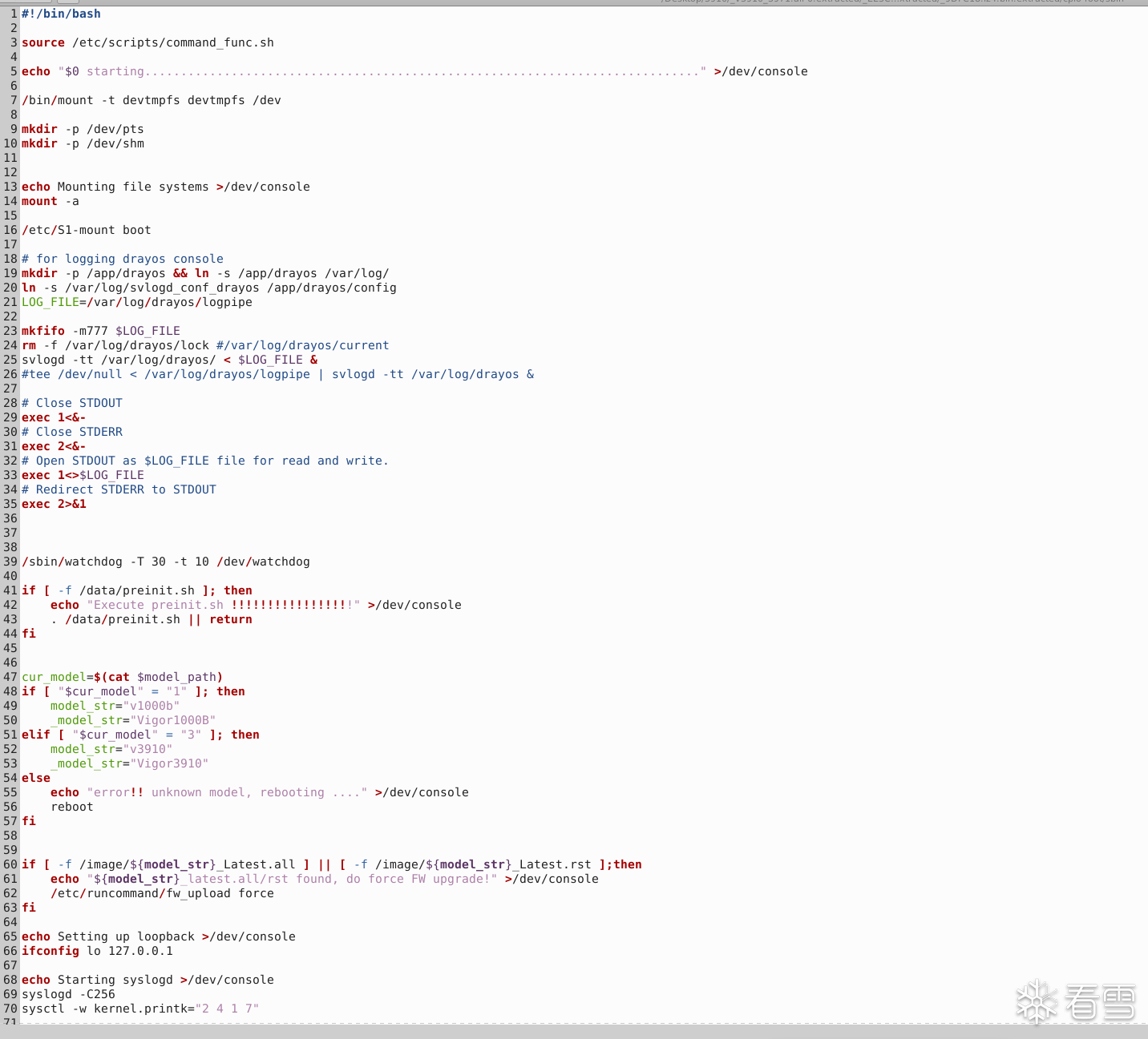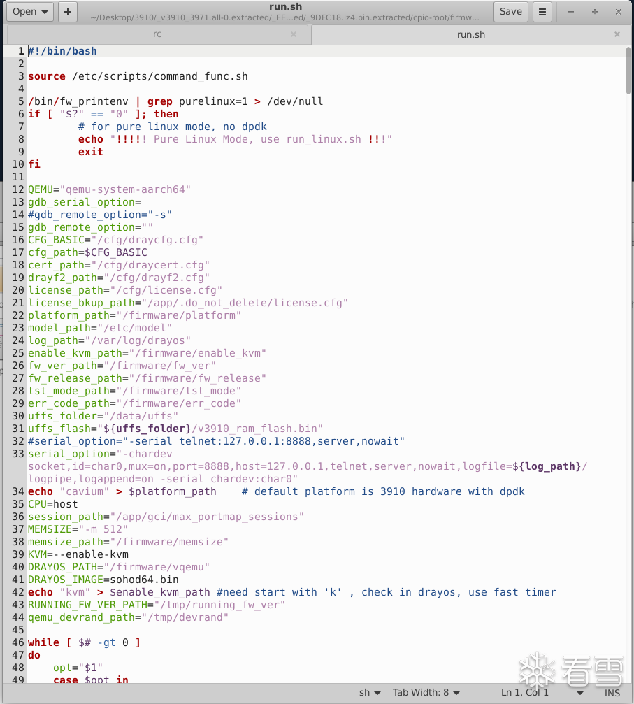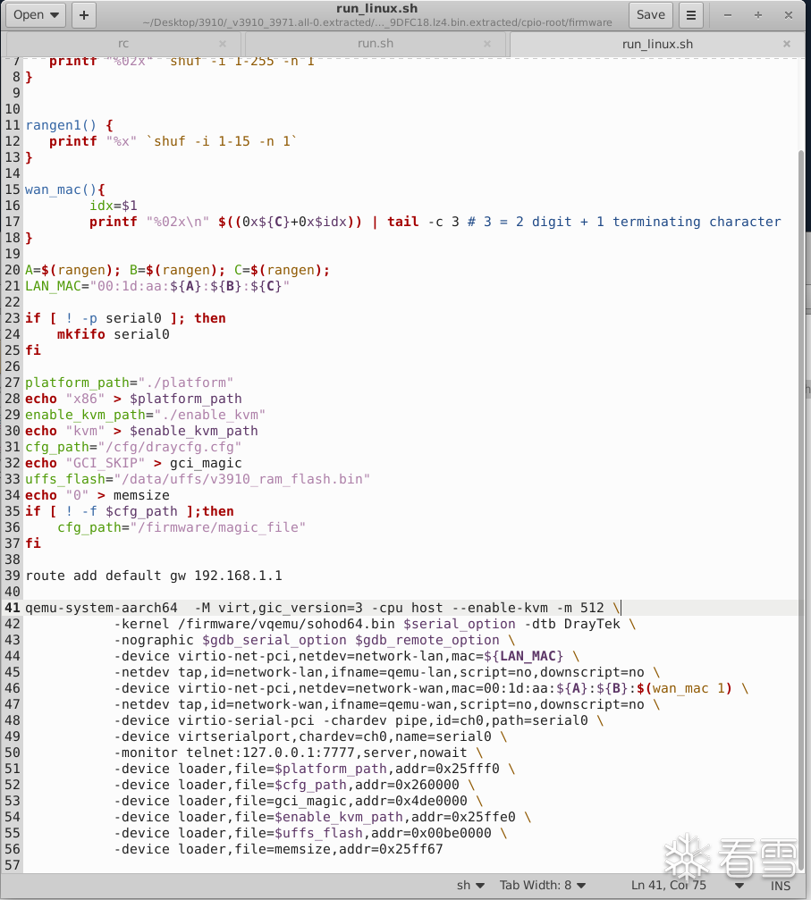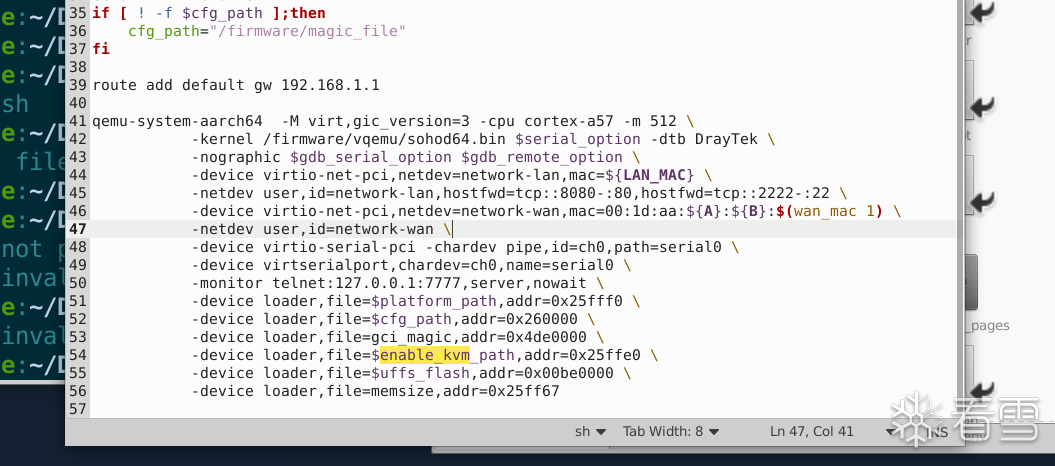 这个脚本是官方开发人员用来启动QEMU模拟环境的原始脚本,sohod64.bin就是核心固件,充当Kernel,其次DrayTek设备树文件(DTB),