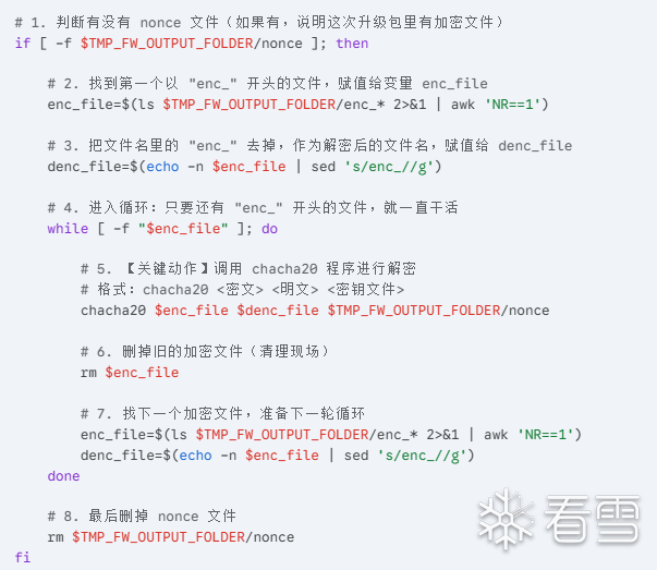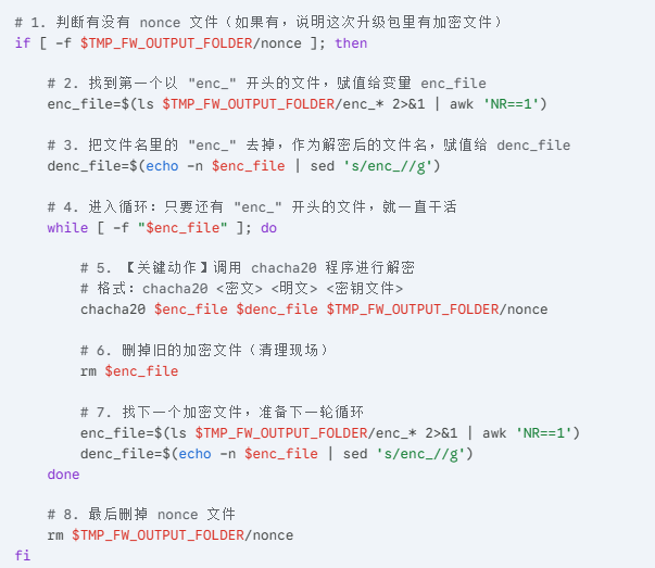 chacha20 $enc_file $denc_file $TMP_FW_OUTPUT_FOLDER/nonce chacha20 <输入文件> <输出文件> <Nonce文件>
