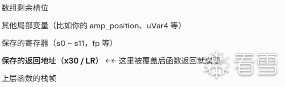 关键是数组容量N是固定的,超过就溢出,为什么QUERY_STRING="&&&&&&&&&&&..."会溢出,因为每循环找到一个"&"就会分隔出一个空参数(Key=""或者Value=""),param_count每次+1,每次写两个4/8字节到param_2+offset,当param_count>N,开始覆盖栈上数组后面的内容,因此覆盖地址如下。