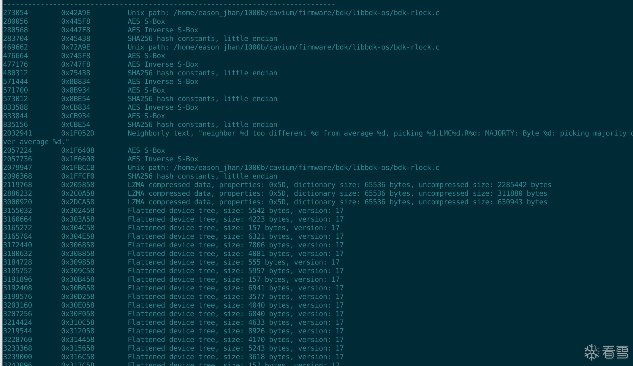 然后我们解包3971版本后出现了很多文件,我们找找有没有可用的。当我们把3910的3971解包后发现了关于AES 的字样,其中有S盒、SHA256 hash。这些提取的文件应该是未加密的,他们包含了AES和SHA256的常量,说明这段代码具备加密的能力,或者进行验证之类的。
