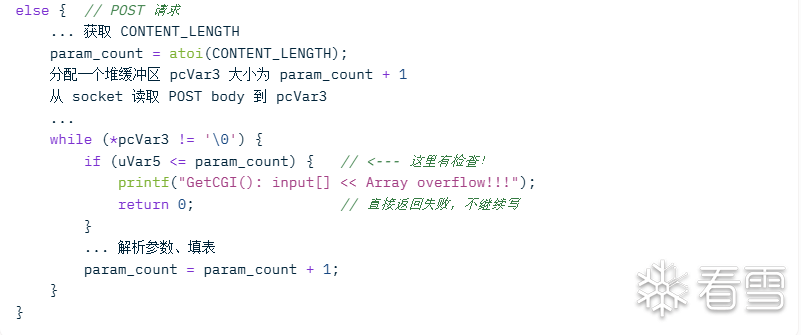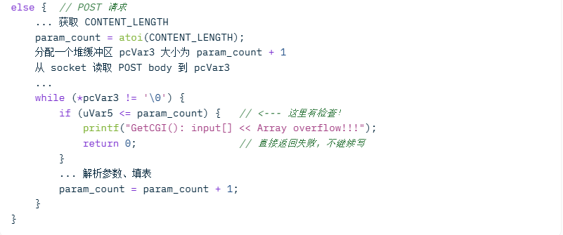 GET 请求路径:无边界检查 → 无数 & → param_count 无限++ → 栈溢出 → CVE-2024-41592 POST 请求路径:有显式检查和日志 → 安全