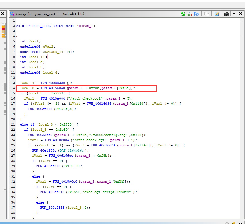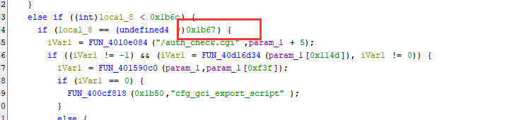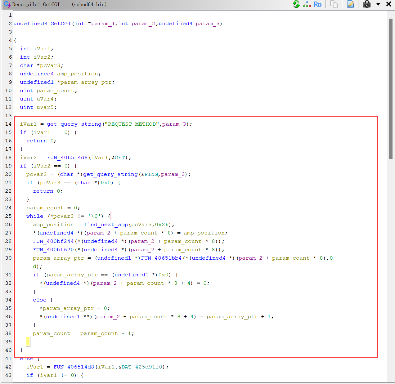 undefined8 GetCGI(int *param_1,int param_2,undefined4 param_3) //三个参数,param_1指向一个HTTP请求结构体,param_2指向栈上分配参数表(要溢出的数组)