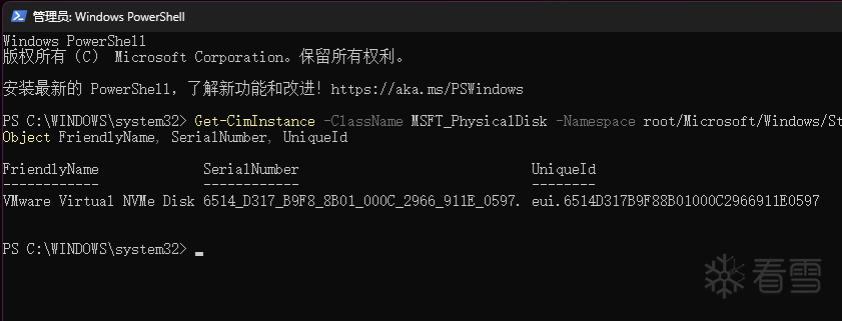 老样子在虚拟机中打开powershell,查询我们的硬盘序列号与UID: