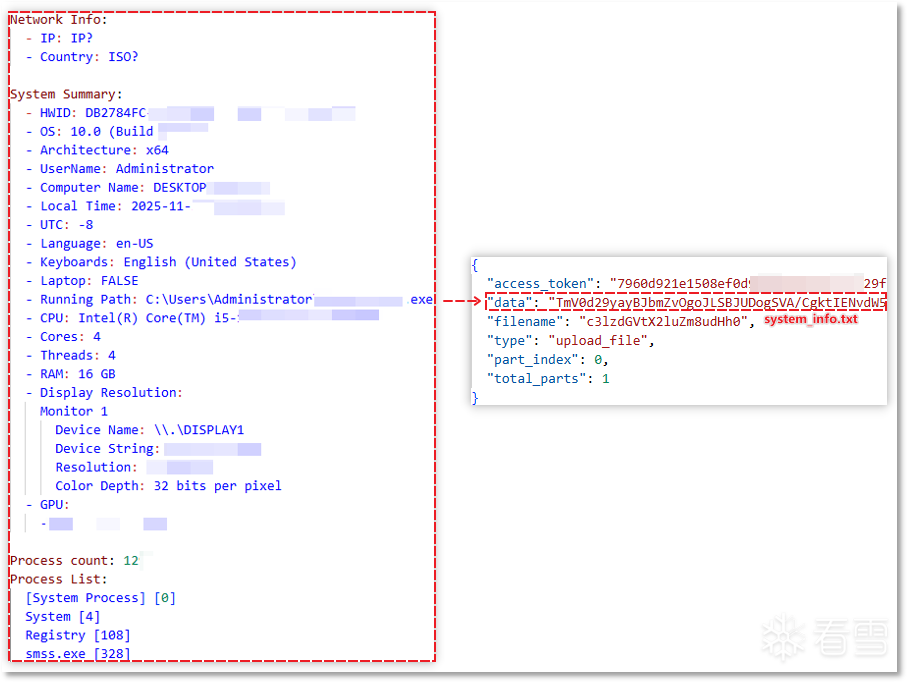 发送系统信息:随后将这些数据如下图左边格式保存,并以下图右边格式发送至远程服务器中,发送时将以下系统信息放到 JSON 数据中 data 字段,将 filename 字段值设置为 system_info.txt 的 Base64 编码格式,表示此次发送的是系统信息。