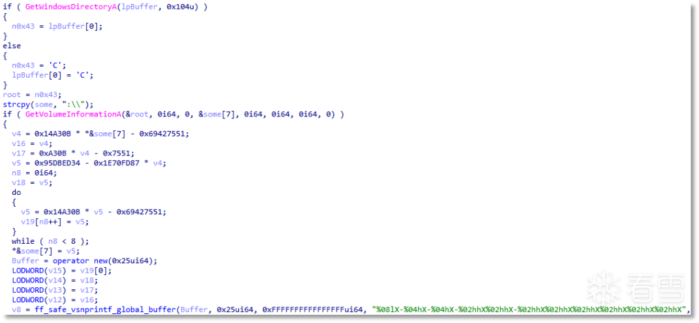 其中用户唯一标识是通过 GetWindowsDirectoryA 与 GetVolumeInformationA 分别获取系统根目录和获取盘符序列号,并通过计算生成用户唯一标识(格式: XXXXXXXX-XXXX-XXXX-XXXX-XXXXXXXXXXXX)。