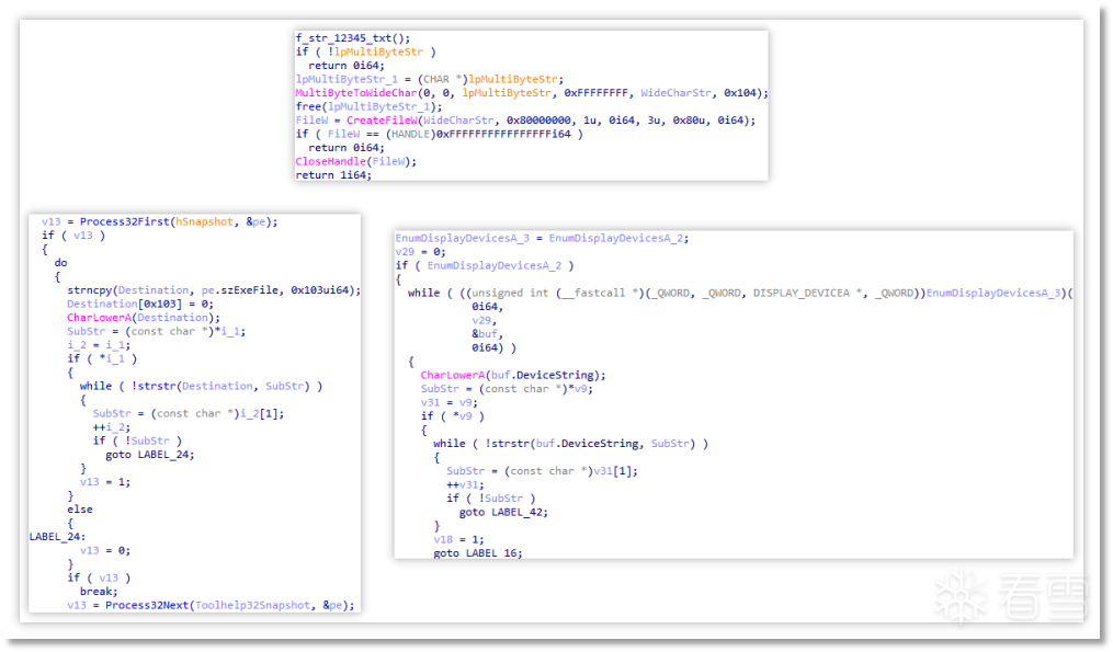 该阶段开始会检测当前目录下 12345.txt 文件是否存在、检测危险进程是否存在、检测虚拟显卡是否存在。
