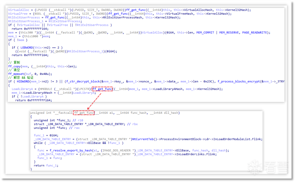 该模块中通过 PEB 的模块枚举并利用动态链接库名称与函数名称的哈希计算获取到匹配的函数地址,例如 VirtualAlloc、VirtualFree、RtlExitUserProcess、LoadLibraryA 等函数,随后通过解密算法解密偏移 0x23C 处的加密数据。