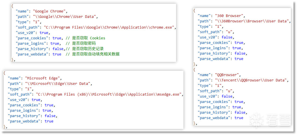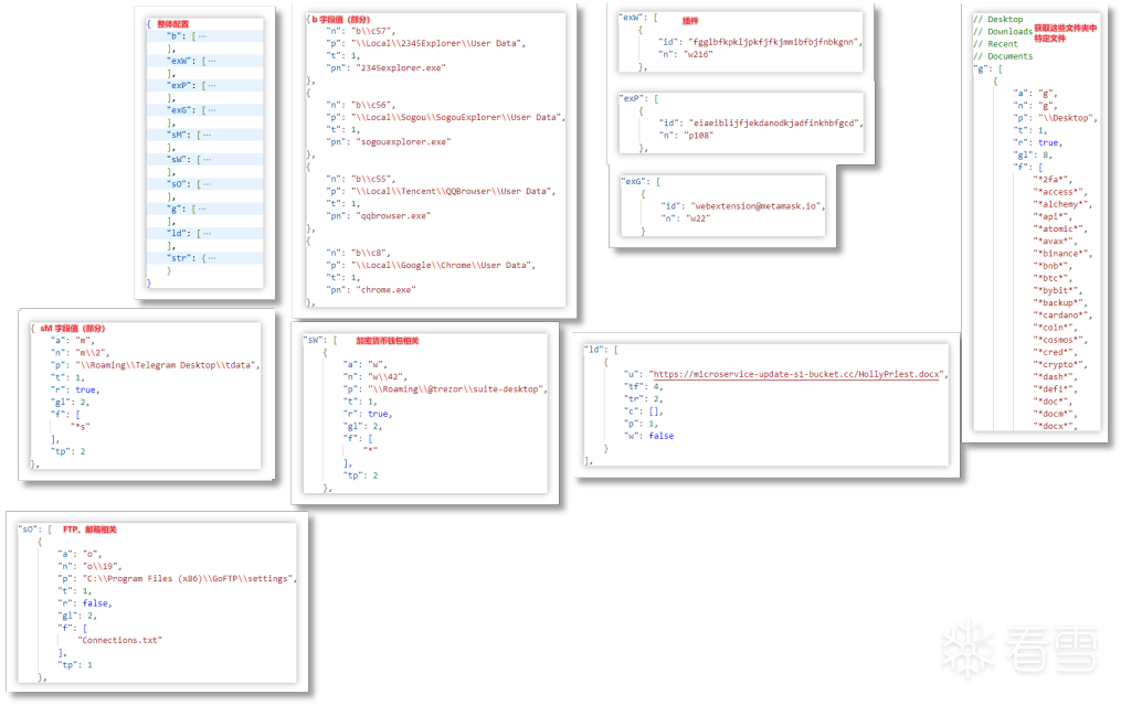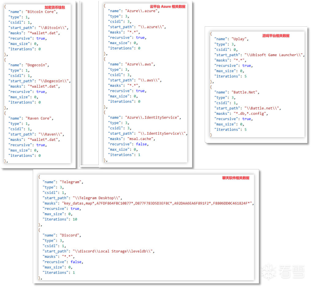 窃密部分以云端下发的窃密配置的结构进行分类。