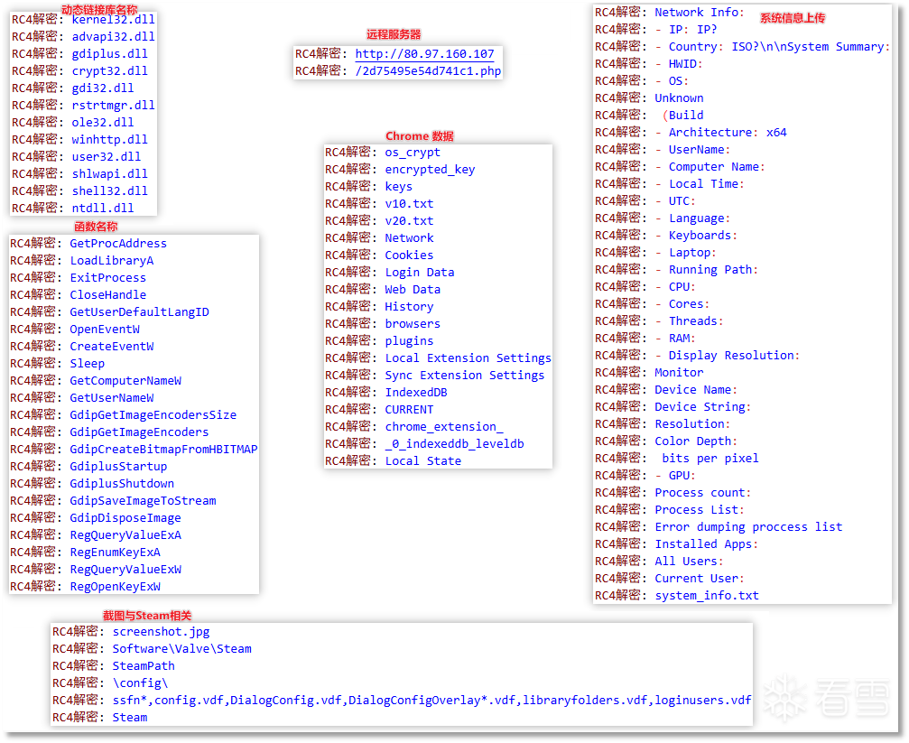 窃密相关:例如 Chrome 数据相关的 History、Login Data,Steam 数据相关的 SteamPath、config.vdf、ssfn* 等字符串。