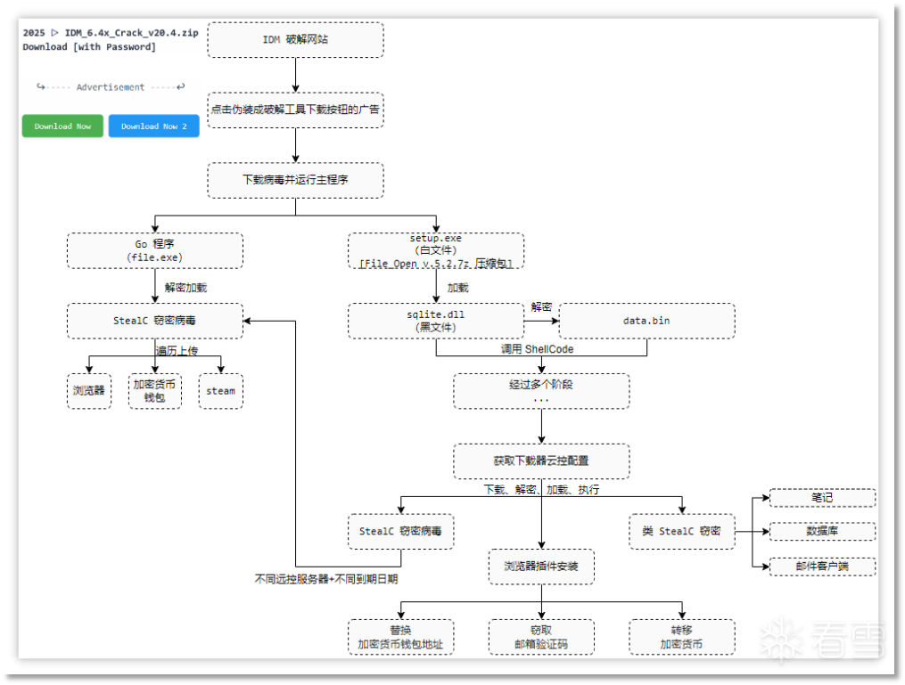 通过对 IDM 破解程序网站广告位传播病毒的全面分析,我们清晰梳理了其从传播伪装、多阶段执行到精准窃密的完整攻击链路。这类病毒以破解软件为诱饵,利用用户对免费资源的需求心理,通过隐蔽的广告位按钮诱导下载,其背后可能会有病毒作者与破解程序作者的利益勾结,更体现了当前网络黑产分工明确、手段专业的特点。
