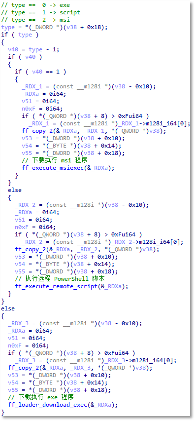 窃密配置中有一个比较特殊的字段 loader,发现该字段为 0 或 1 都会执行,区别是 0 时会在窃密结束前运行,1 时会在窃密初期运行。