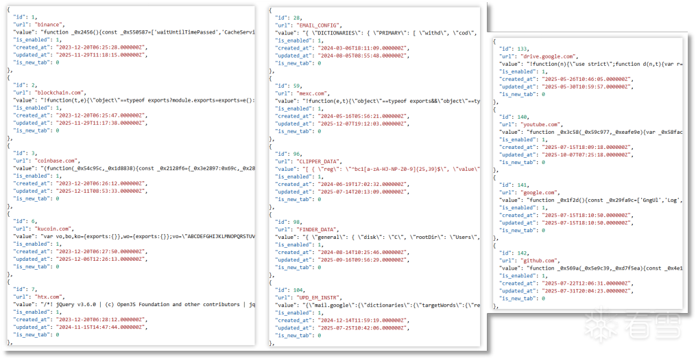 下图为部分窃密云控配置:其中 url 为匹配的域名,value 为对应的脚本或规则。