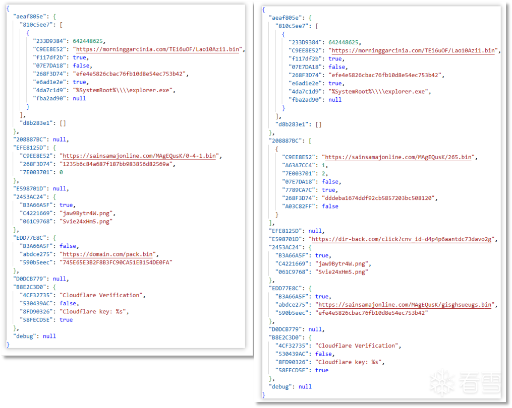 经两次不同请求获取到两份云控配置,从中可发现部分字段值并非在每次云控配置中均存在。
