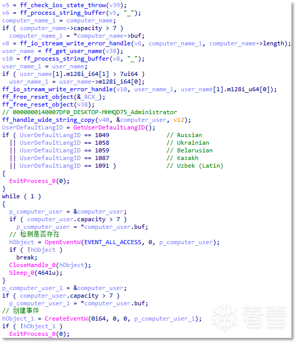 随后,借助 GetUserDefaultLangID 函数来判断当前区域的语言是否为俄语、乌克兰语、白俄罗斯语、哈萨克语、乌兹别克语等。若符合其中任意一种,进程将即刻退出。之后,通过函数地址、计算机名以及用户名组合成事件名,并尝试对其进行打开或者创建操作,以此确保仅有一个进程处于运行状态。