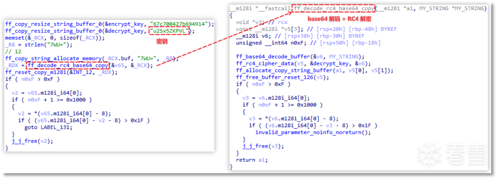 解密字符串:首先会利用 Base64 和 RC4 算法解密被加密字符串,其中 RC4 算法密钥为 u2Sx5ZKPVL。