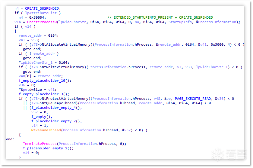 随后开始解密 ShellCode,并寻找 explorer.exe 进程并获取该进程句柄,利用 PROC_THREAD_ATTRIBUTE_PARENT_PROCESS 设置父进程,用于随后创建傀儡进程时候伪装成被 explorer.exe 进程所创建,随后通过 NtQueueApcThread 注入并恢复线程执行 ShellCode。