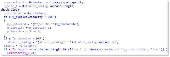 被封禁则终止进程:如果被远控服务器检查到了异常则可能会被封禁,此时返回的数据包则是 {"5dabacxxx53bf03":"8f9eeaxxx12ca","opcode":"blocked"},接收数据包后在代码中判断 opcode 是否为 blocked,若为 blocked 则会利用 ExitProcess 函数退出进程。