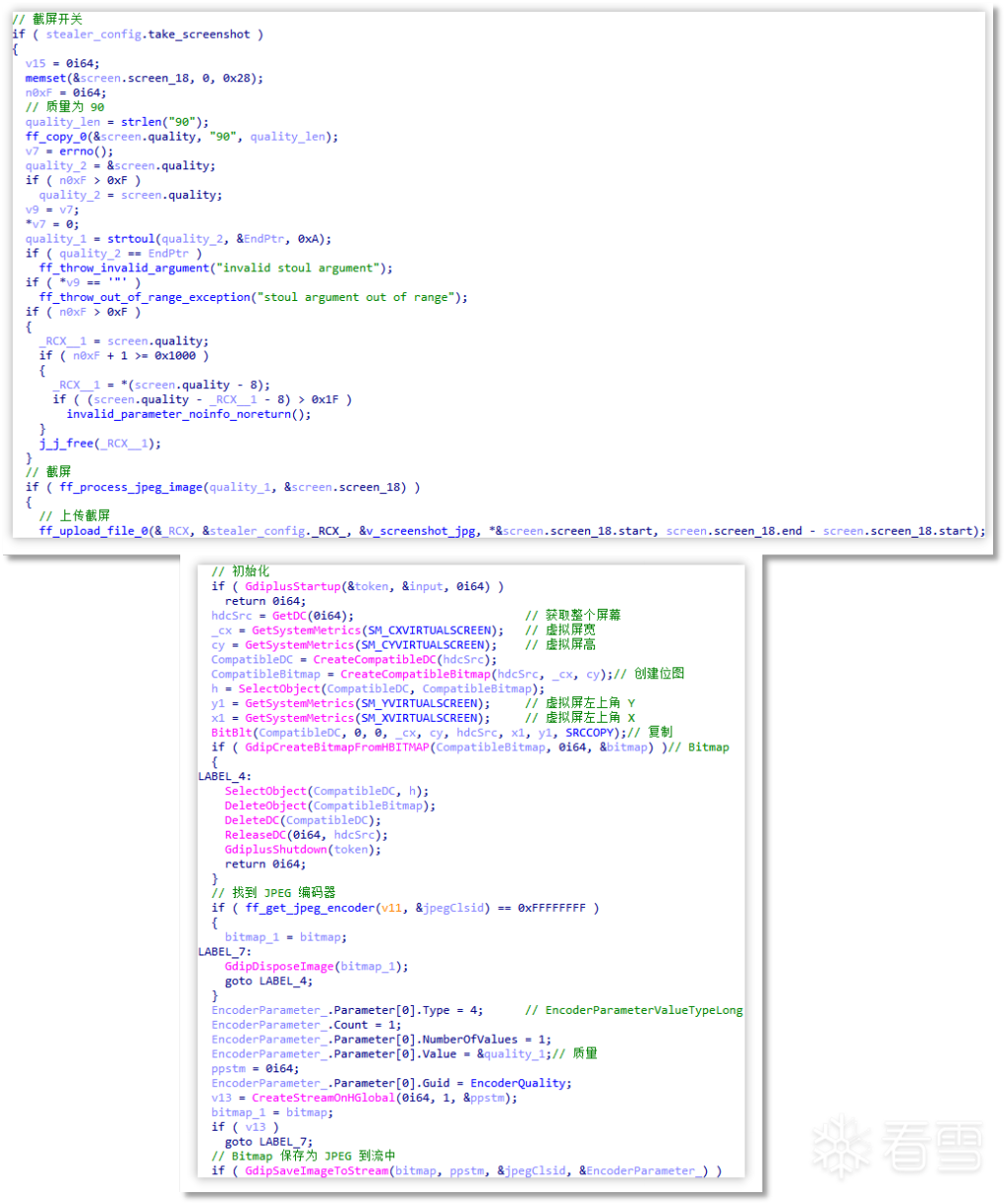 截屏:截屏开关为 take_screenshot,若为 1 则开始截图,截图利用 JPEG 编码格式,并设置为质量 90 发送到远程服务器中。