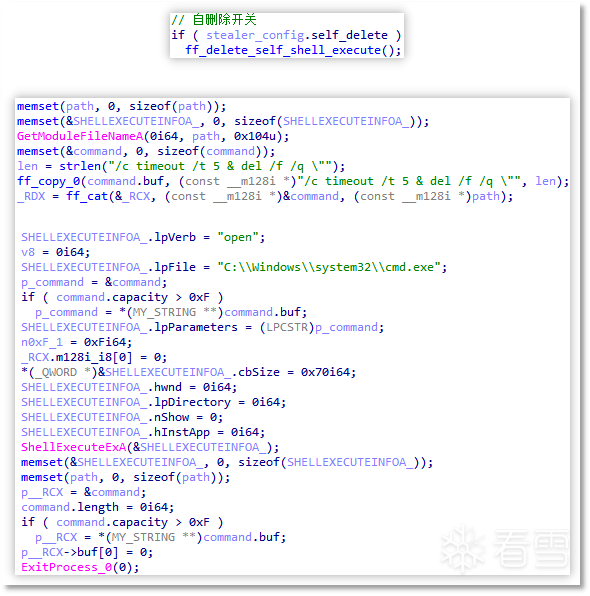 自删除:窃密结束后会有自删除开关,若开启的时候会通过 ShellExecuteEx 函数执行 cmd.exe /c timeout /t 5 & del /f /q {当前进程路径},实现五秒后静默删除并退出。