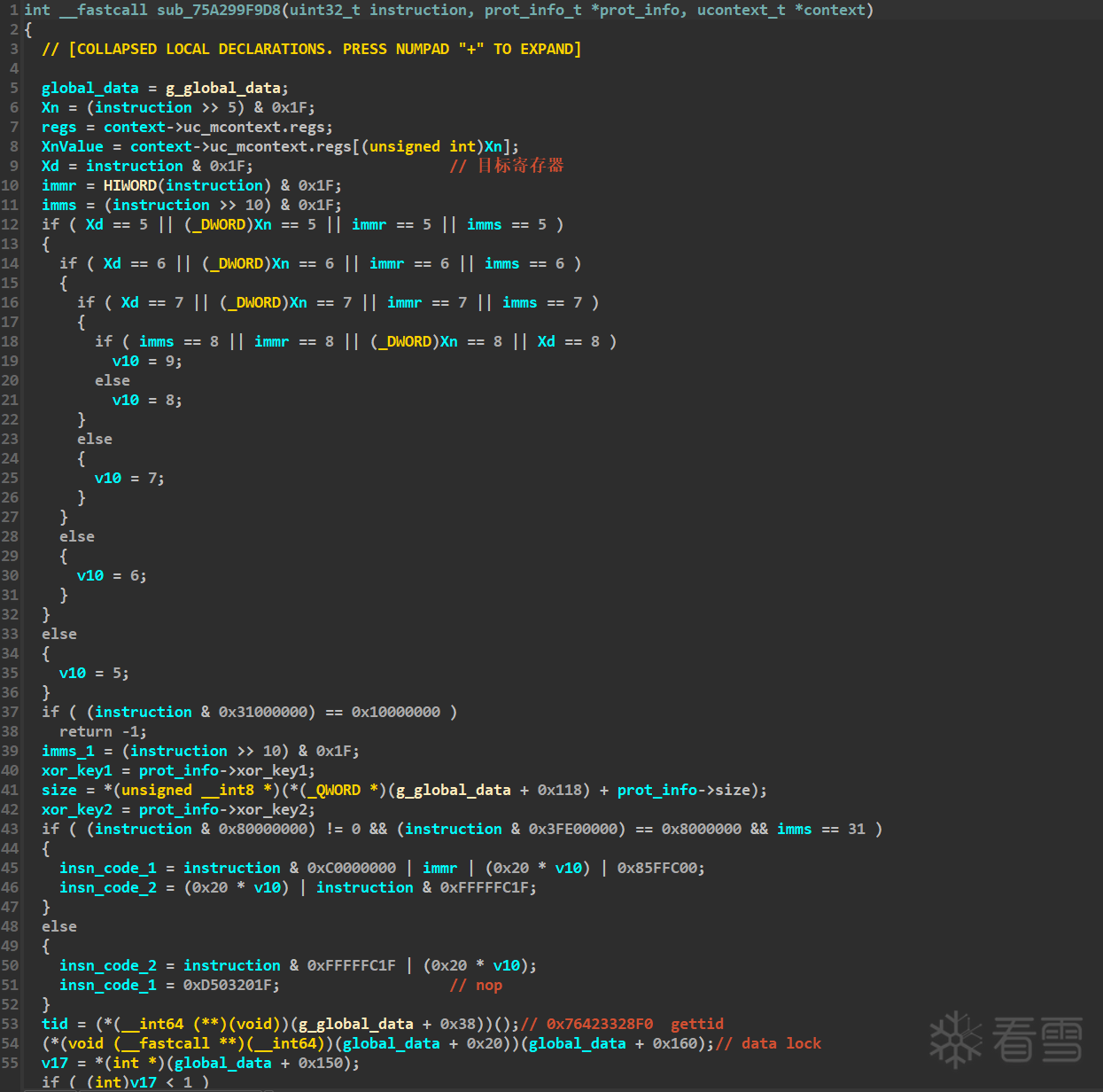 与直接读写内存的指令类似,解析指令拿到指令隐性使用到的寄存器值,解密值并将其写回context,随后直接模拟执行来修正异常指令执行后的context并跳过该指令