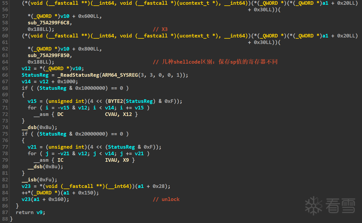 代码预置了四个类似的shellcode,唯一区别是解析shellcode参数时用到的寄存器分别为X0、X1、X2、X3,其目的是为了防止解析参数的寄存器影响到模拟执行结果