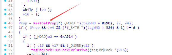通过调用函数RealGetProp最终得到对应窗口的DisplayAffinity的值。函数RealGetProp在模块win32kbase.sys中,我们在windbg中通过模拟执行来走一遍流程: