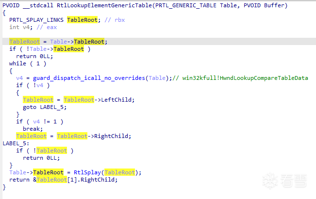 因为IDA中Buffer[0] = a1;a1是窗口句柄,那么我们定位到的entry的位置也是窗口句柄所在的位置。然后我们到ntoskrnl.exe中查看函数RtlLookupElementGenericTable:
