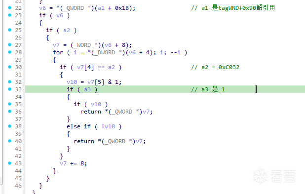 可以看到数据结构依旧使用的二叉树,RtlLookupElementGenericTable中通又使用了HwndLookupCompareTableData函数进行查找,聪明的你肯定想要使用RtlDeleteElementGenericTable尝试删除二叉树节点,这样调用hspLookupWindow就无法找到我们播放器顶级窗口的相关节点信息。不过,还需要注意删除节点后的窗体不能被激活刷新,否则会出现一些异常。当然删除节点后也并非就完全找不到了,因为删除节点后PRTL_SPLAY_LINKS Links->Parent依旧存在,TableRoot->LeftChild清零,TableRoot = TableRoot->RightChild清零,我们可以内存搜索hWnd,根据Links->Parent所在内存区段,并且左右子树清零的内存特征进行搜索。