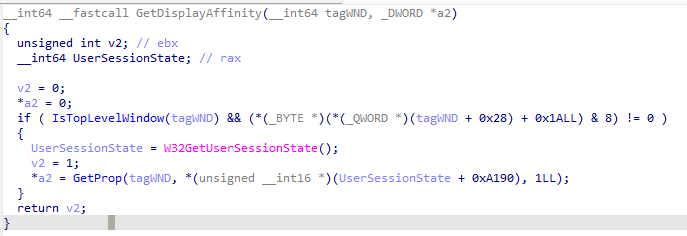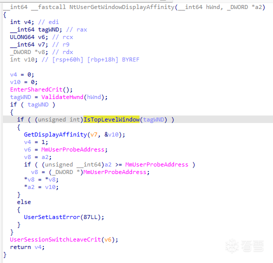 函数将我们的窗口句柄通过函数ValidateHwnd转为了tagWND,通过IsTopLevelWindow判断是否是顶级窗口,这个函数体内也可以帮助我们修复部分tagWND结构的成员。我们可以通过调用ValidateHwnd函数的方式获取到CE窗口的tagWND,也可以通过24H2最顶级二叉树节点窗口句柄0x10002,遍历所有tagWND。GetDisplayAffinity函数的参数1依旧是我们获取到的tagWND。