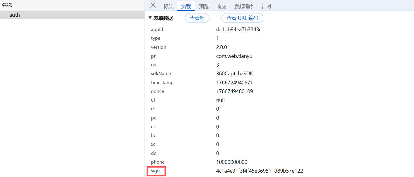 1 2 3 4 5 6 7 8 9 10 11 12 13 14 15 16 17 18 19 20 21 22 23 24 25 26 27 | function sign(_0x392c78) { const _0x2639ff = _0x5354ca; const _0x18ee40 = { appId: _0x392c78["aid"], type: 1, version: _0x392c78["version"], pn: _0x392c78.pn, os: _0x392c78.os, sdkName: _0x392c78["sdkName"], timestamp: Math.round(new Date()["getTime"]()), nonce: Math["round"](new Date()["getTime"]()) + Math["floor"](100000000 * Math["random"]()), ui: null, rc: 0, pc: 0, ec: 0, hc: 0, xc: 0, dc: 0, phone: _0x392c78["phone"] }; let _0x3ca1de = ''; const _0x2a4d77 = Object["keys"](_0x18ee40).sort(); for (let _0x1ee694 = 0; _0x1ee694 < _0x2a4d77["length"]; _0x1ee694++) { _0x3ca1de += String(_0x2a4d77[_0x1ee694]) + String(_0x18ee40[_0x2a4d77[_0x1ee694]]); } return _0x18ee40["sign"] = md5(_0x3ca1de), _0x18ee40; }; |
