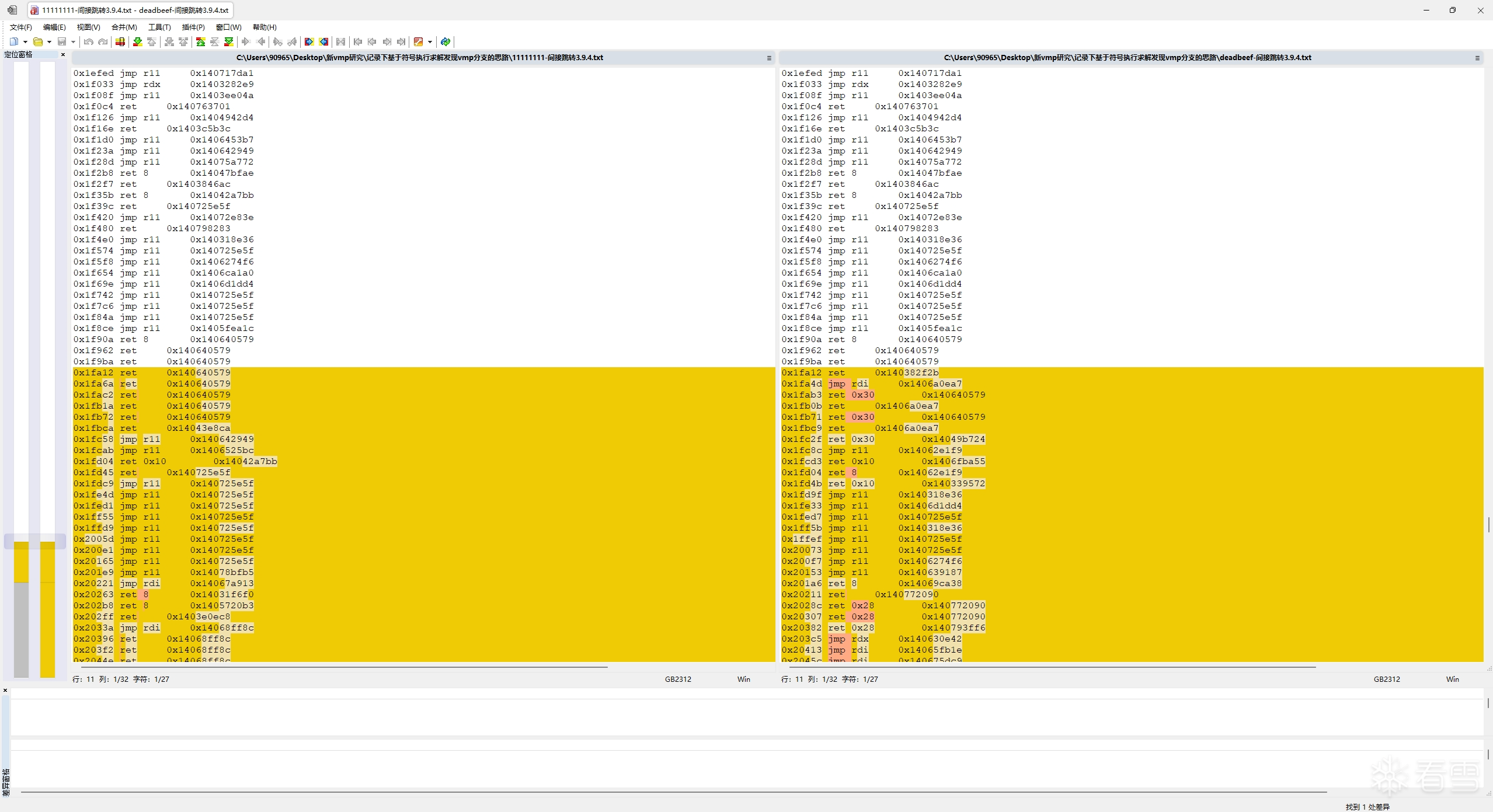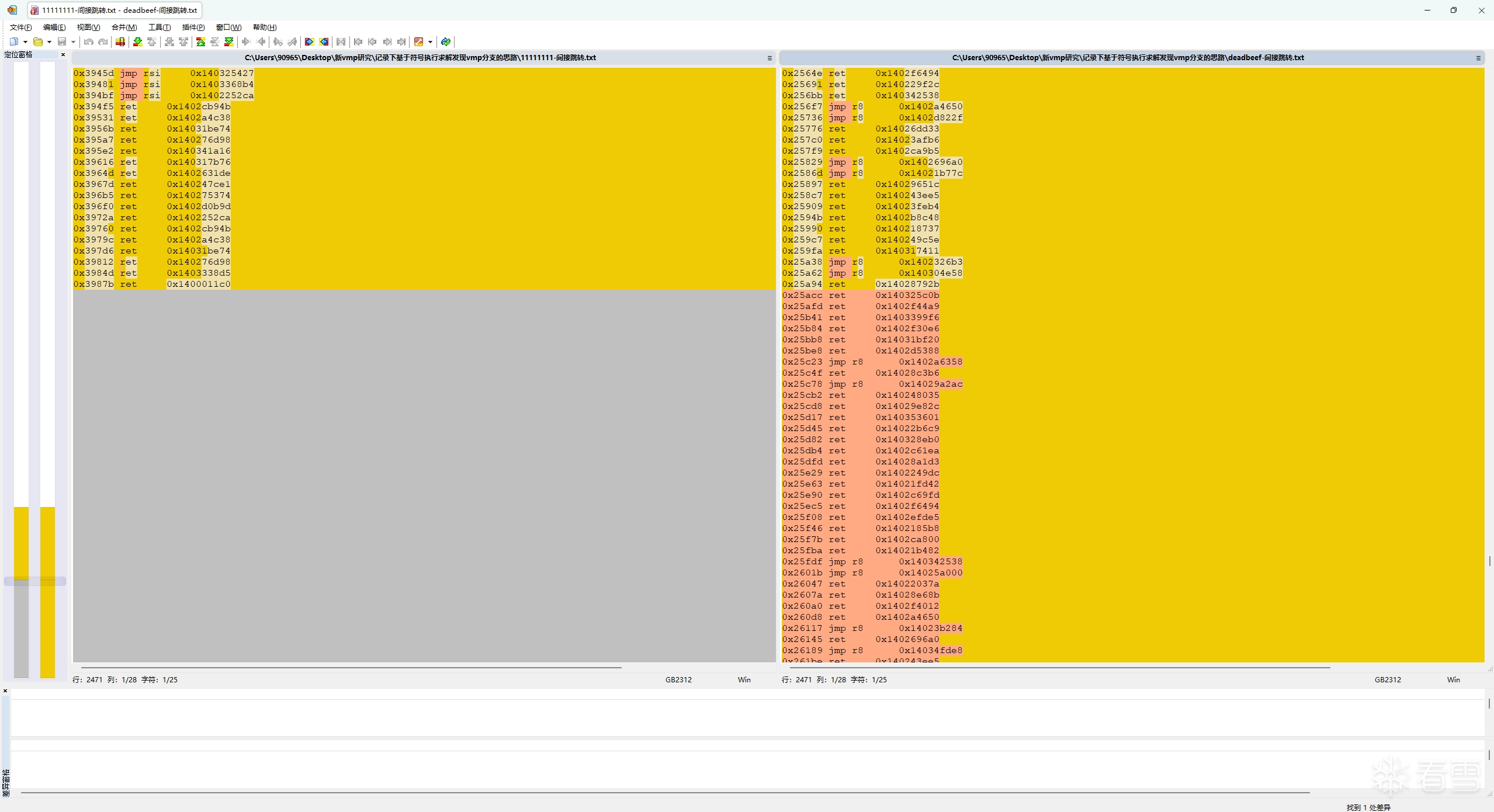 用这段代码分别给 11111111.trace64 和 deadbeef.trace64 进行分析,把控制台输出结果保存到txt里,再用WinMerge进行差异对比