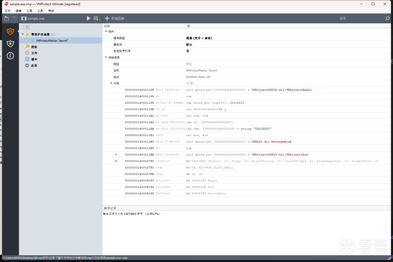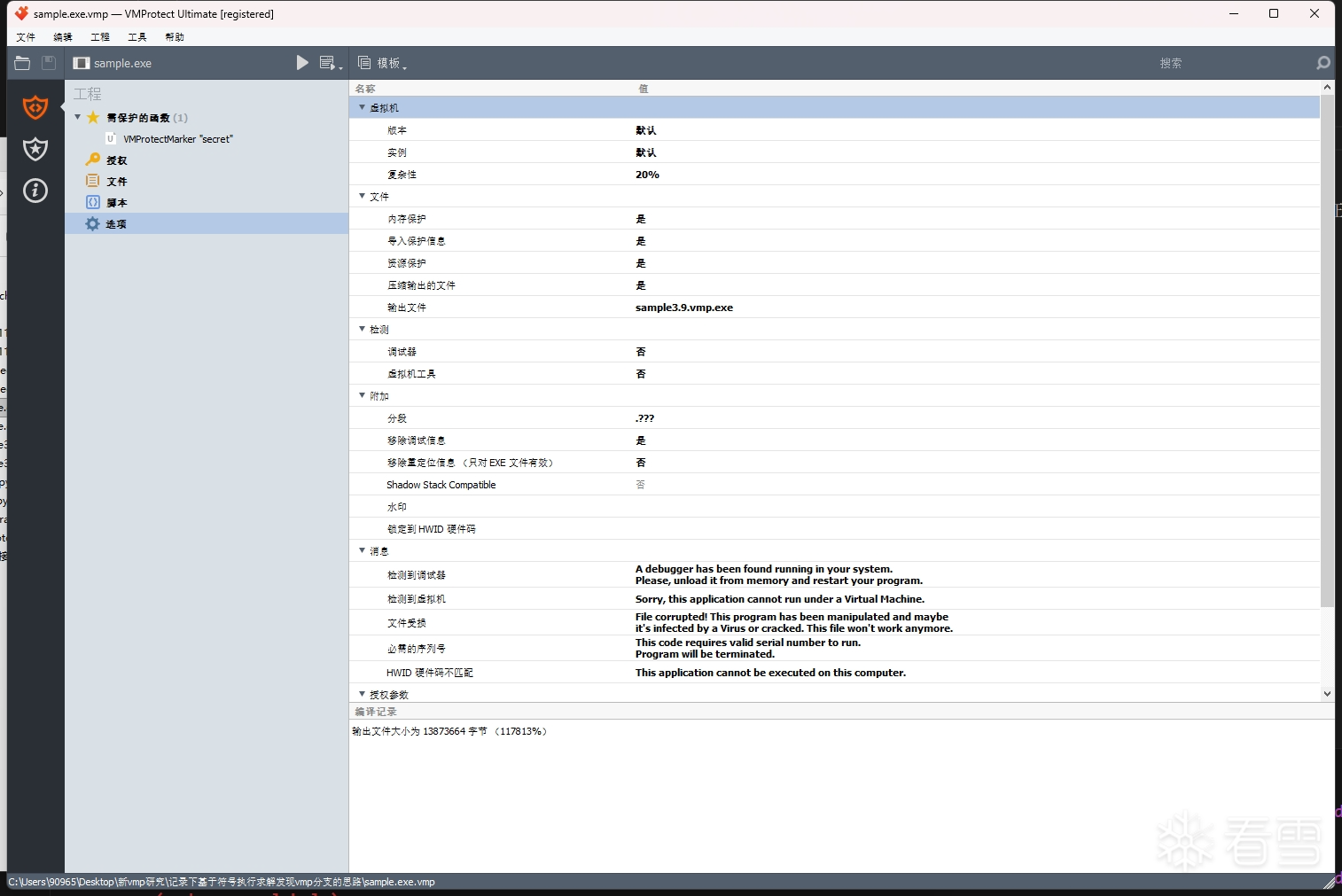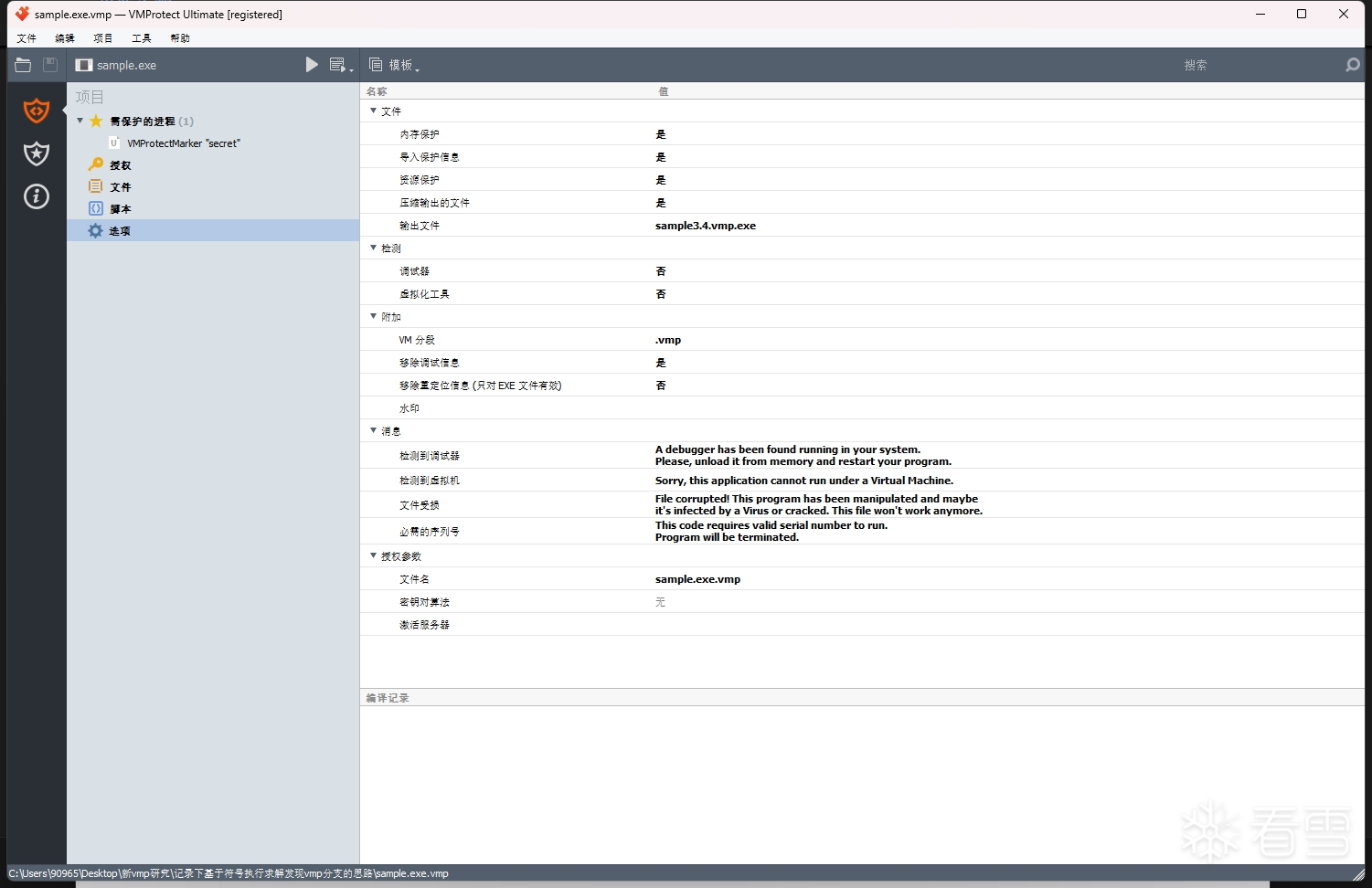 接着用 vmp 3.4 来加壳保护,函数选项设置为 超级(变异 + 虚拟),文件保护选项均默认选择 是