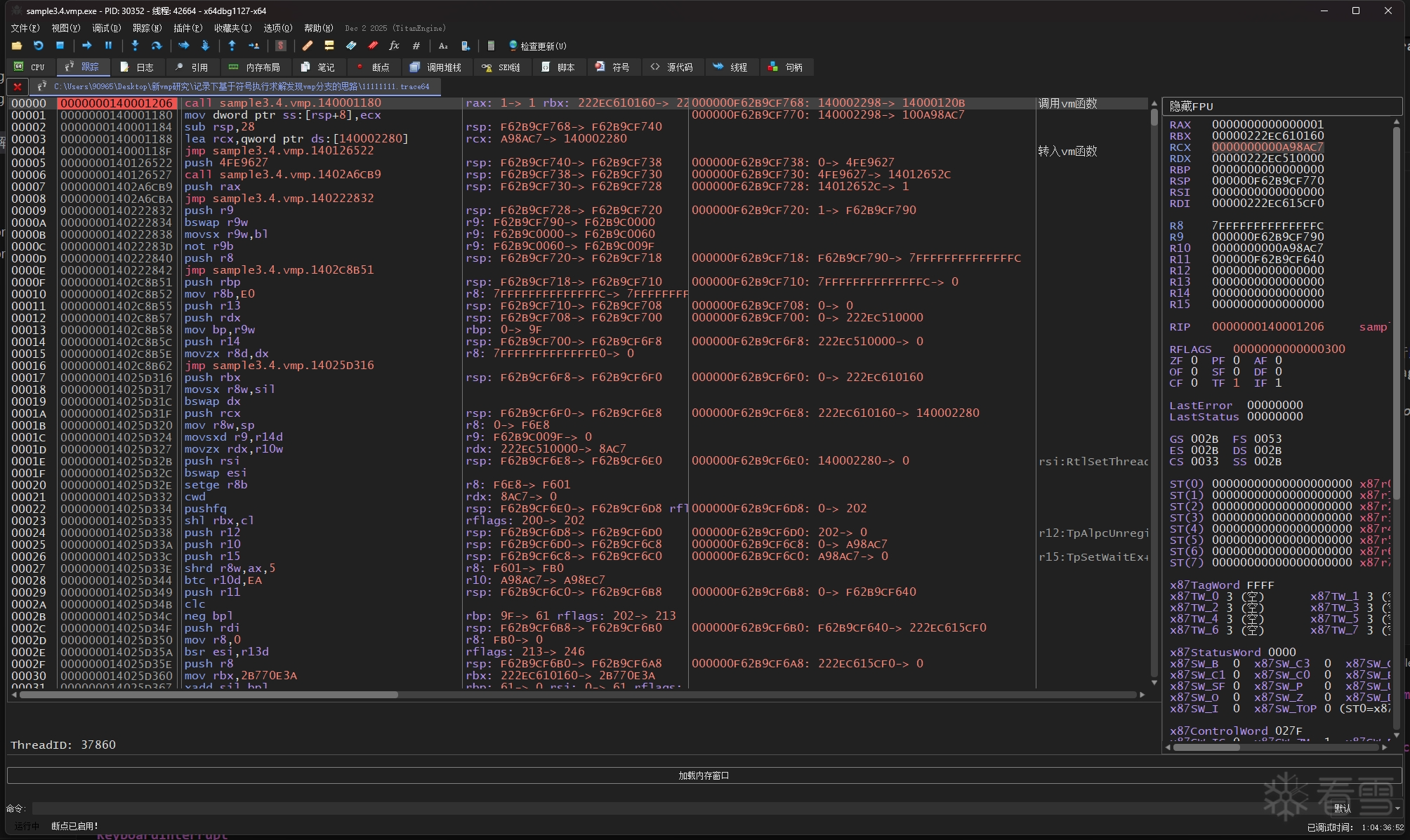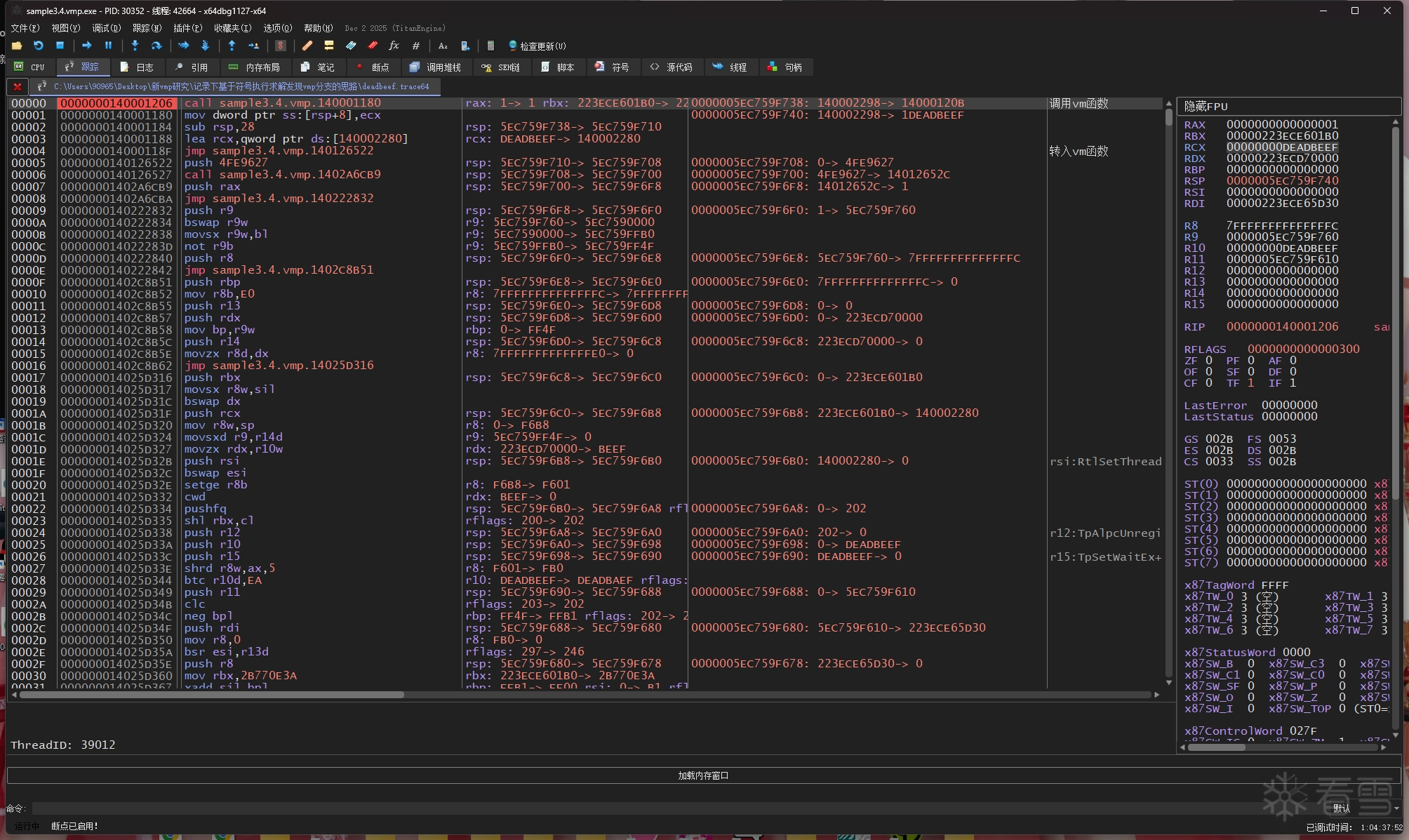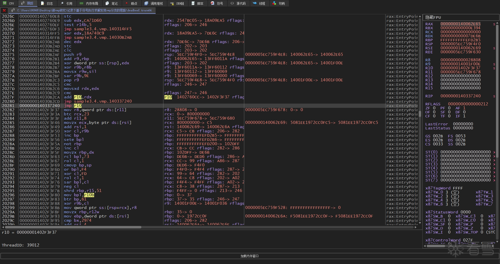 然后使用 x64dbg 的追踪功能来记录被vm函数的完整指令追踪记录,先找到vm函数,在vm函数的开头和结尾处下断点,然后开启x64dbg的跟踪,等到结尾处的断点被命中后就可以关闭跟踪得到完整的trace文件。