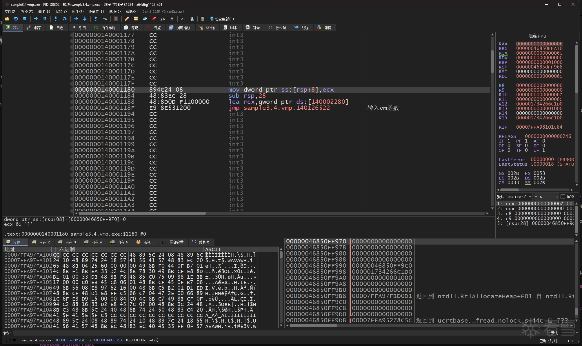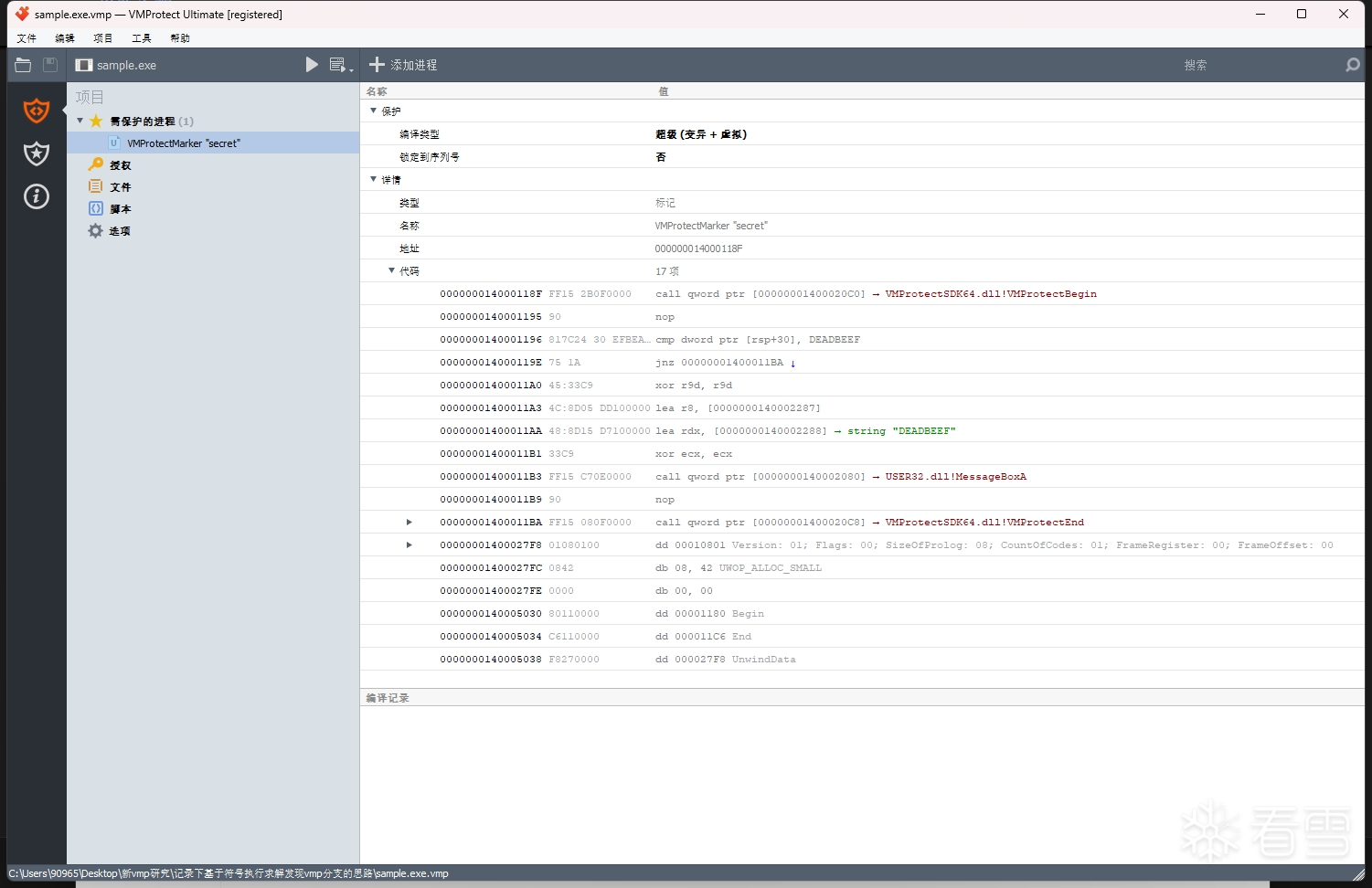 上面用到的样本是用 vmp3.4 加壳的,实际上我也用过vmp 3.9.4来测试: