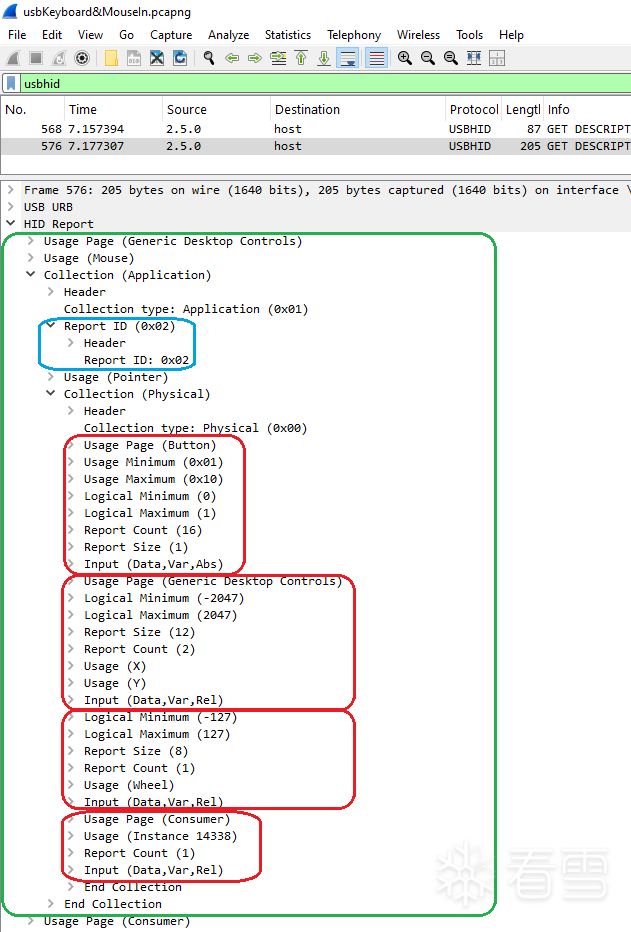 a). 按UsagePage/Usage/Collection & End Collection进行分组(绿框部分) ;
