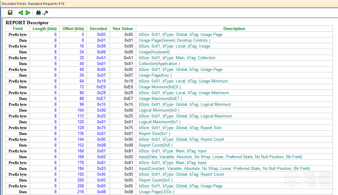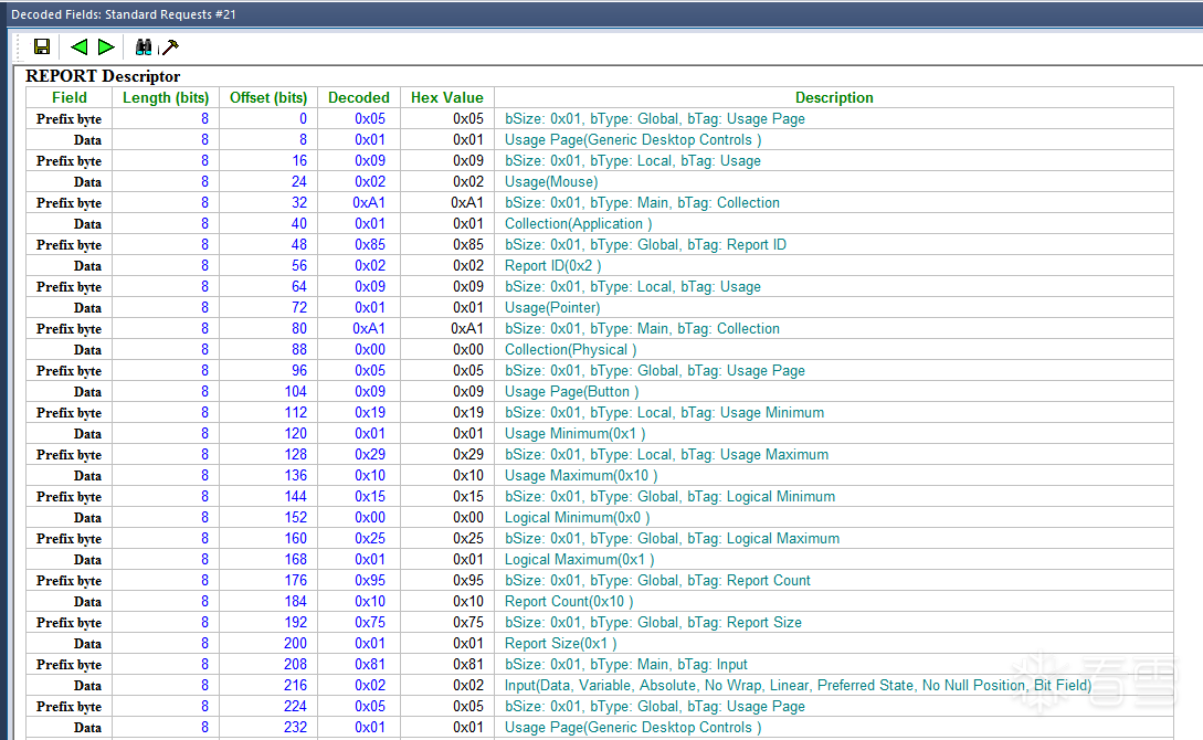 结合USB Mouse HID Report Descriptor的描述, 可得到各字段值: