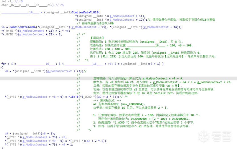 2.在Modbus_Read_Holding_Registers_Response(sub_8000998)中发现了存在陷入死循环、内存越界读取、索引劫持与缓冲区溢出的风险(漏洞),如下图: