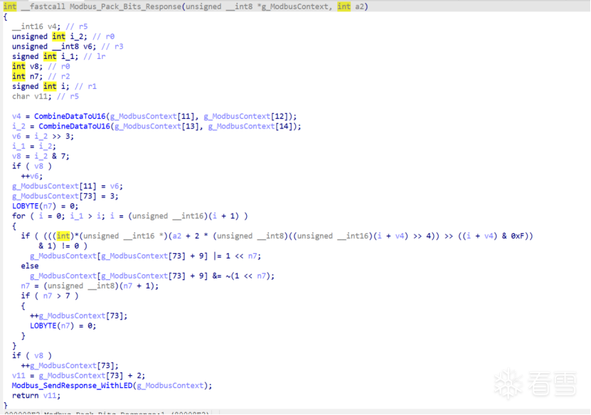 Offset 73在Modbus_Read_Holding_Registers_Response等ModBus相关的函数中高频使用,发现该变量充当了响应包构建过程中的动态写指针,如下图:
