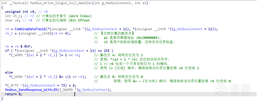 3.Modbus_Write_Single_Coil_Handler(sub_8000A00)发现了任意内存比特位篡改漏洞: